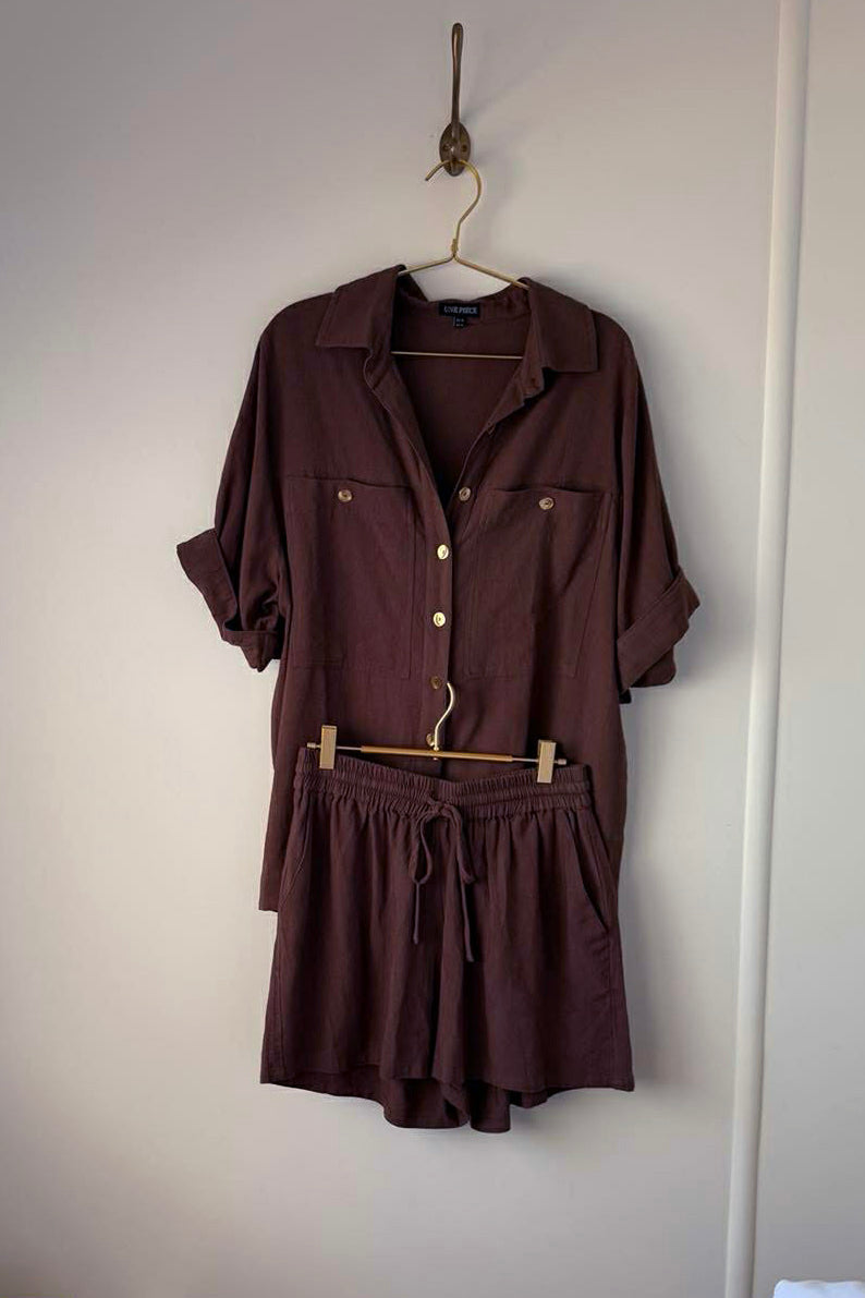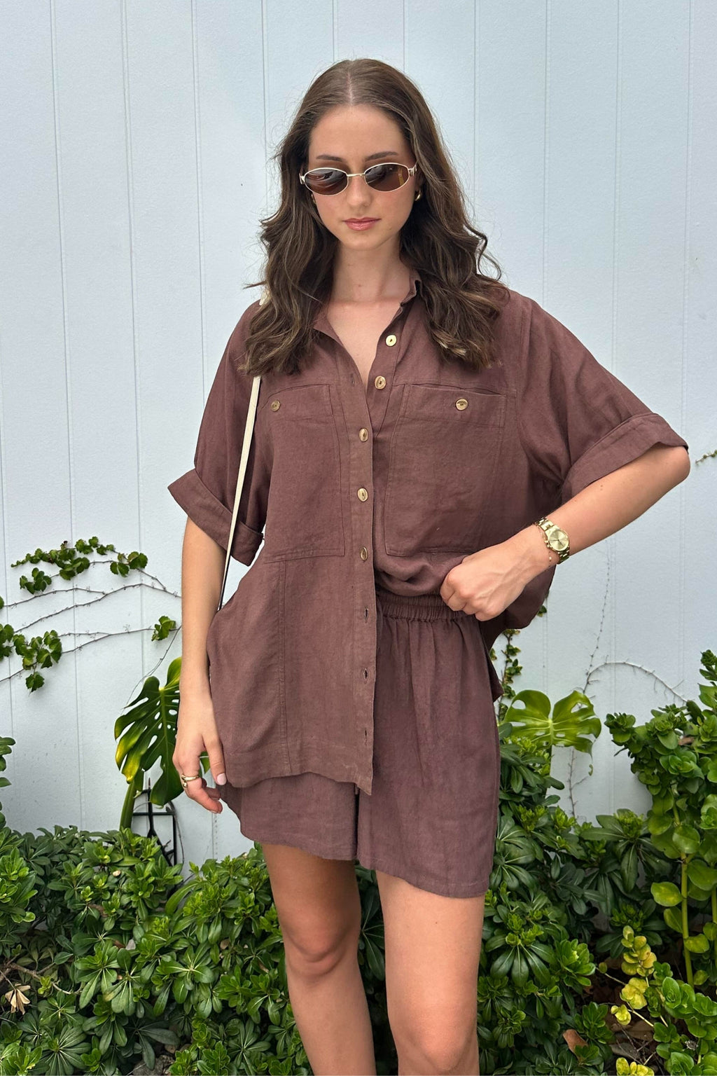 A Summer wardrobe staple. Crafted from soft feel fabric in this season’s hottest chocolate brown hue. Features adjustable drawstring waist and side pockets.